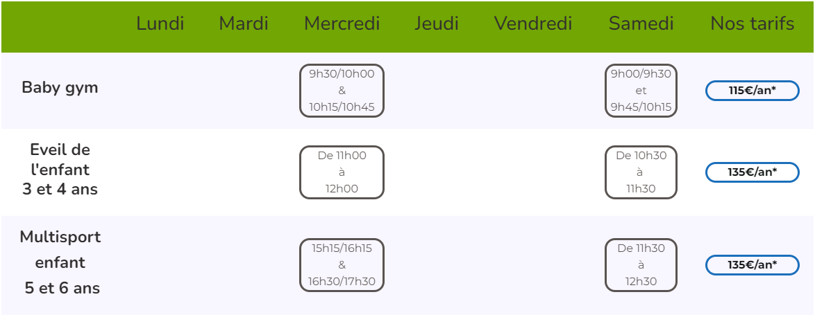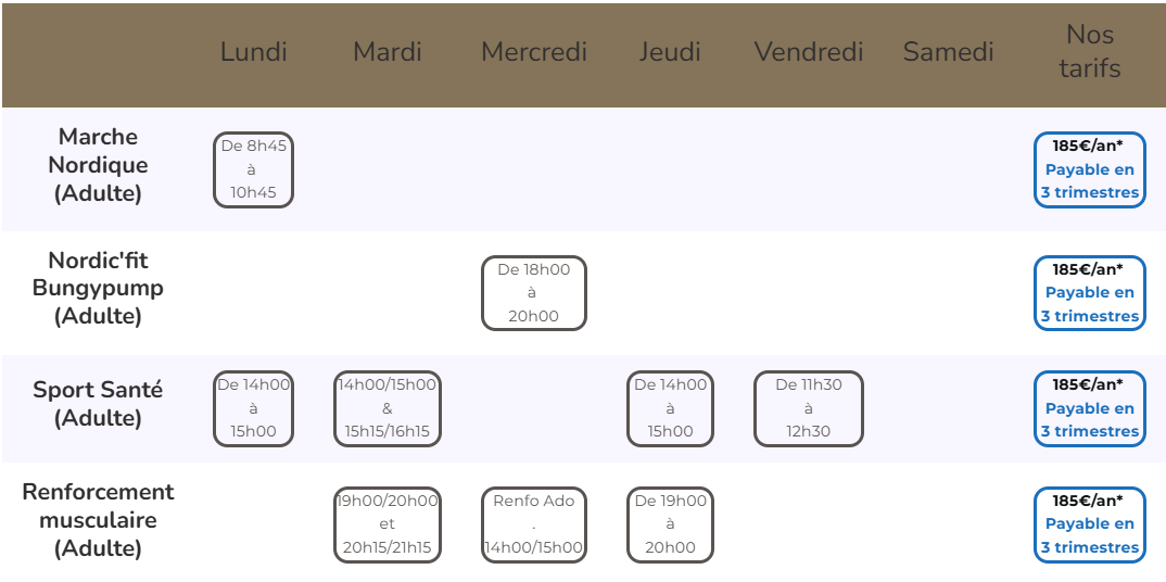 Sport Santé | De 14h00 à 15h00 | 14h00/15h00 & 15h15/16h15 | De 14h00 à 15h00 | De 11h30 à 12h30 | |||