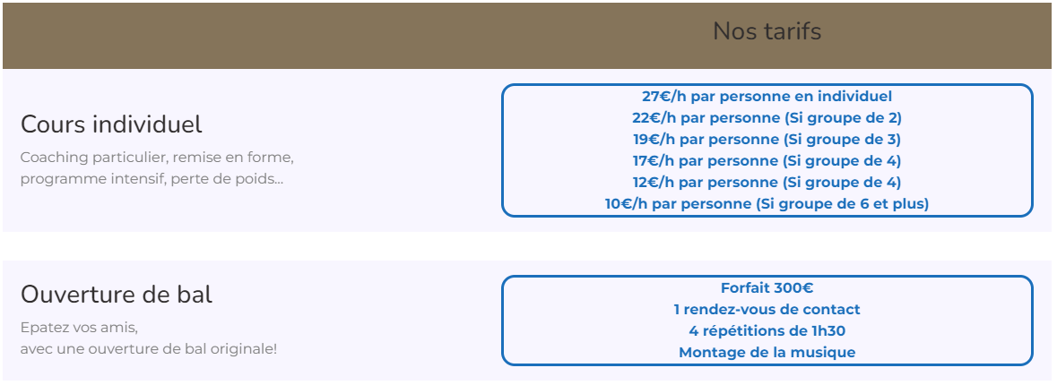 Cours individuelCoaching particulier, remise en forme, programme intensif, perte de poids... | 27€/h par personne en individuel 12€/h par personne (Si groupe de 4) |